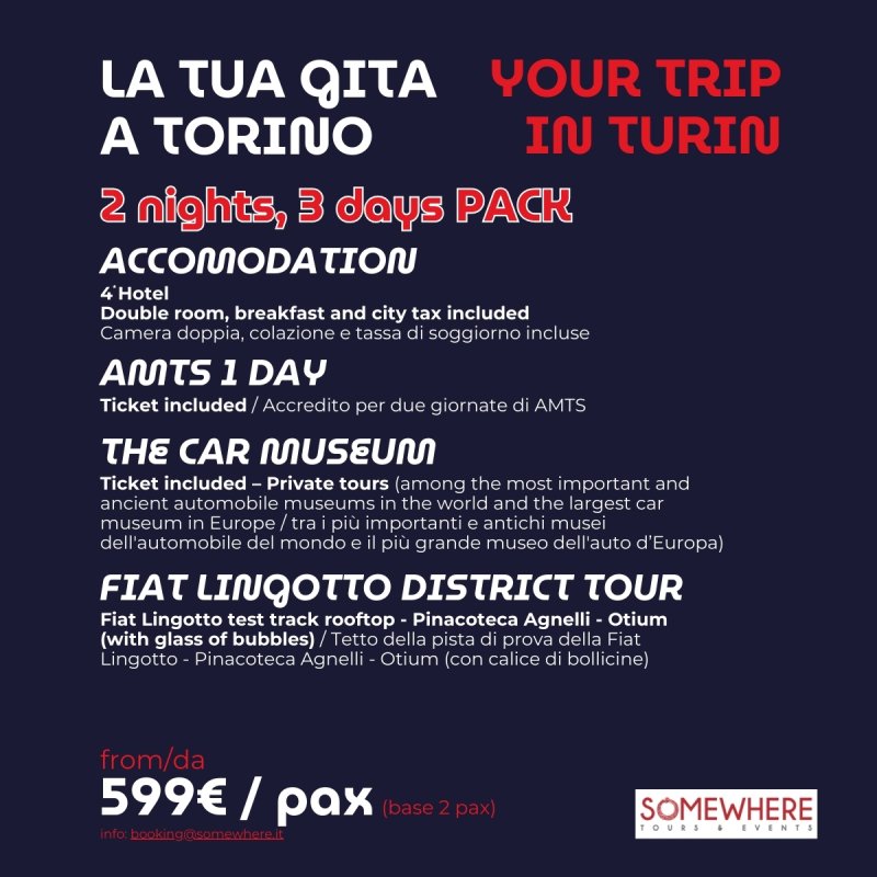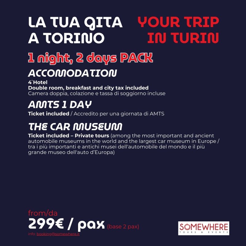 1 notte in hotel 4* nel distretto Lingotto, colazione, tassa di soggiorno, biglietto AMTS 1 giorno, guida privata, ingresso al Museo dell’Automobile, visita guidata